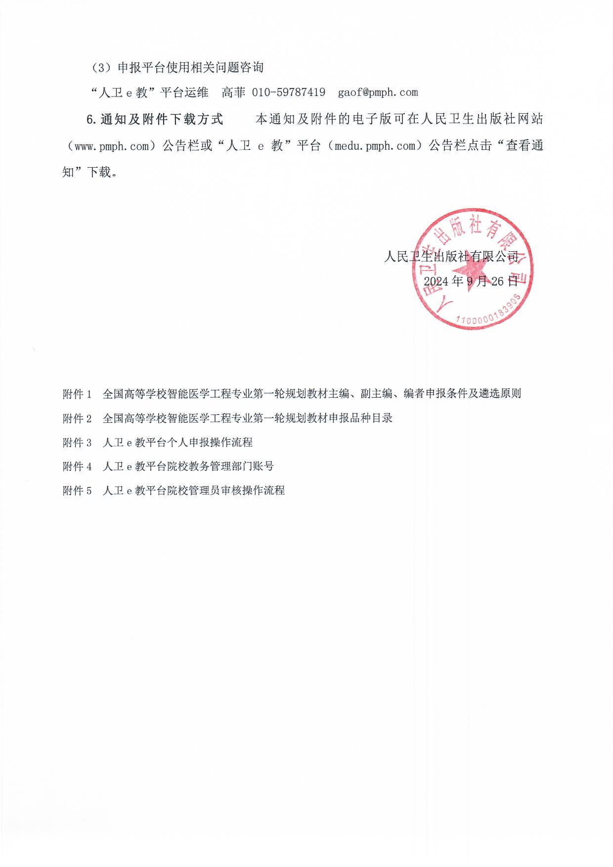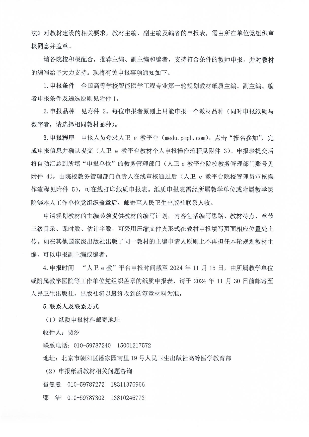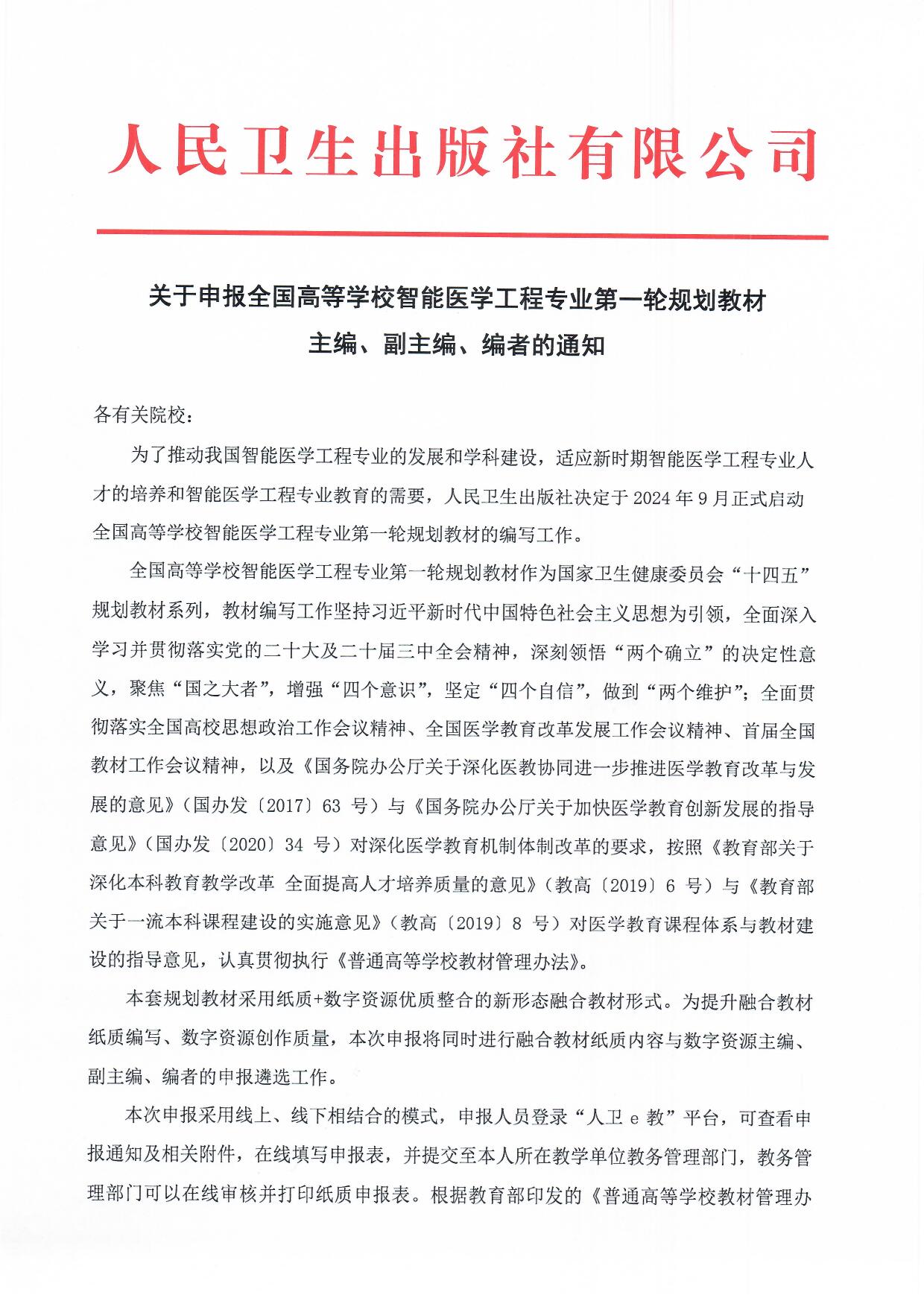 为了推动我国智能医学工程专业的发展和学科建设,适应新时期智能医学工程专业人才的培养和智能医学工程专业教育的需要,人民卫生出版社决定于2024年9月正式启动全国高等学校智能医学工程专业第一轮规划教材的编写工作。