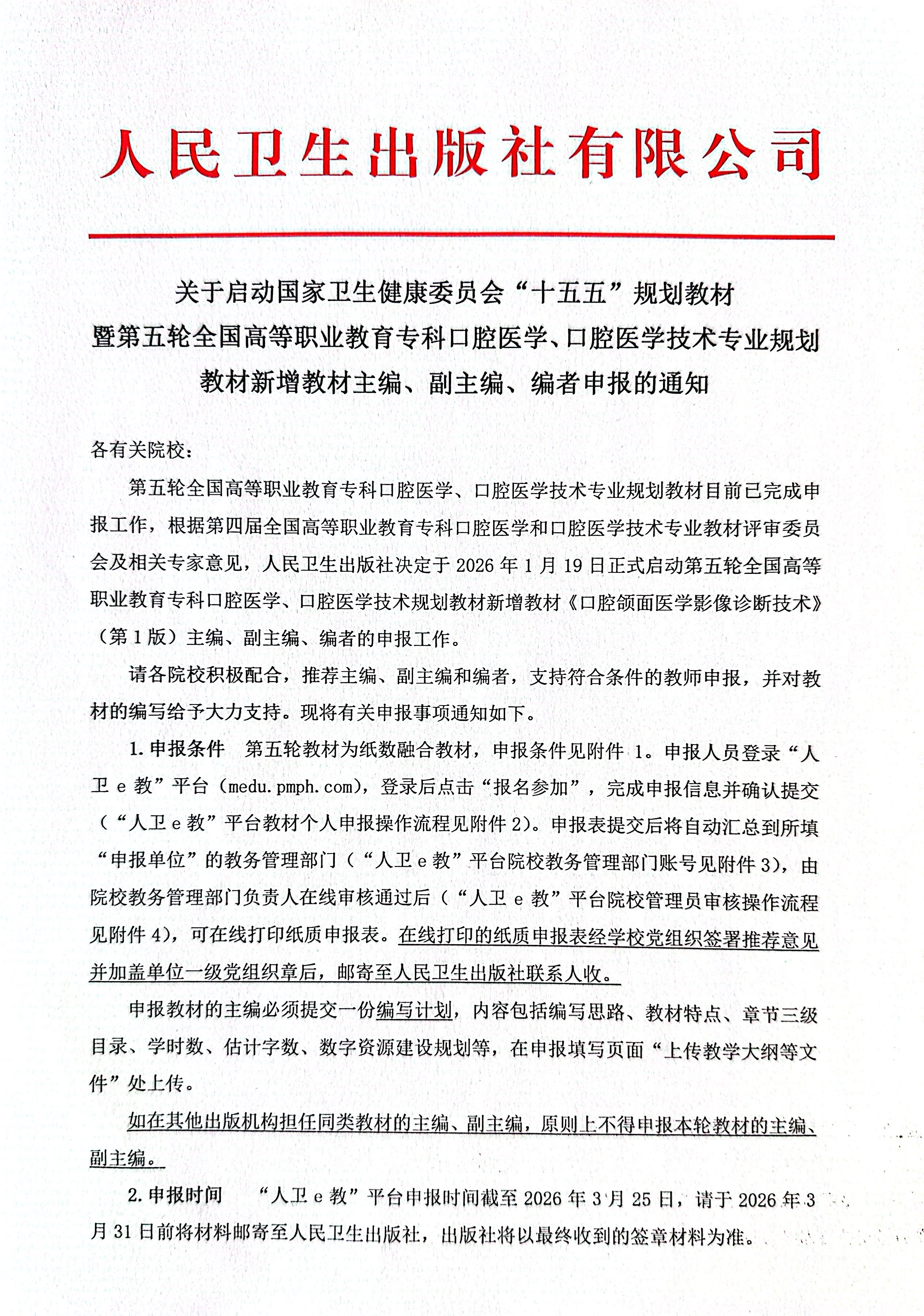 第五轮全国高等职业教育专科口腔医学、口腔医学技术专业规划教材目前已完成申报工作,根据第四届全国高等职业教育专科口腔医学和口腔医学技术专业教材评审委员会及相关专家意见,人民卫生出版社决定于2026年1月19日正式启动第五轮全国高等职业教育专科口腔医学、口腔医学技术规划教材新增教材《口腔颌面医学影像诊断技术》(第1版)主编、副主编、编者的申报工作。